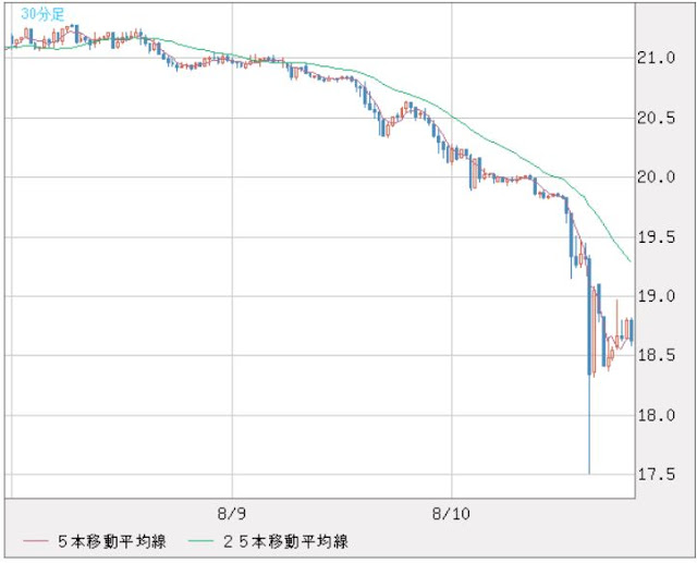 ちょっと前まで30円近くをウロウロしてたのが、今日一瞬17.5円を下回って、今頃18.6円付近をウロウロしてる。